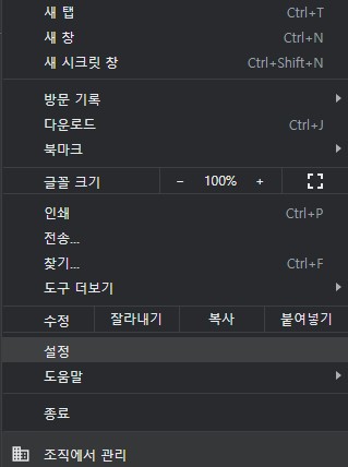 먼저 크롬 웹브라우저를 실행시키신 다음 우측 상단의 설정으로 들어가줍니다.