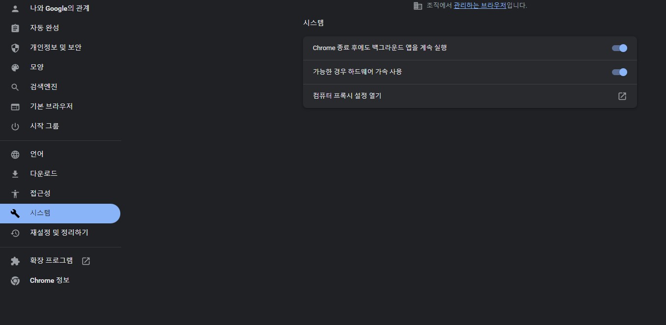 시스템에 오시면 chrome 종료 후에도 백그라운드 앱을 계속 실행 버튼을 끄거나 켜주시면 설정 끝입니다.