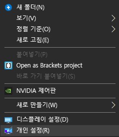 먼저 사용자의 컴퓨터 바탕화면을 우클릭하여 줍니다. 그럼 탭이 하나 뜨며 이 탭에서 하단에 있는 디스플레이 설정(D)를 클릭하여 디스플레이 설정 창을 띄어 줍니다.