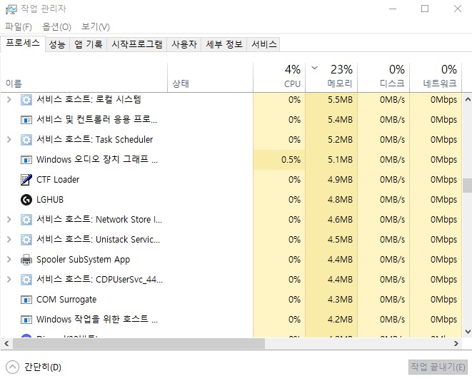 작업 관리자는 'ctrl + shift + esc 키'를 동시에 입력하여 작업 관리자를 열어준 뒤 연결된 프로그램을 마우스 클릭하여 활성화시켜준 다음 우측 하단의 '작업 끝내기(E)'를 클릭하여 닫아주시면 됩니다.