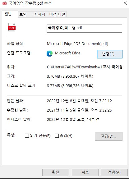 연결 프로그램 확인 방법은 해당 pdf 파일을 우클릭하여 탭을 열어준 다음 '속성'에 들어가 줍니다. 그리고 속성 창에 연결 프로그램:에 있는 '변경(C)'을 클릭해 줍니다. 이후 pdf 프로그램이나 웹 브라우저를 연결하여 주시면 됩니다.