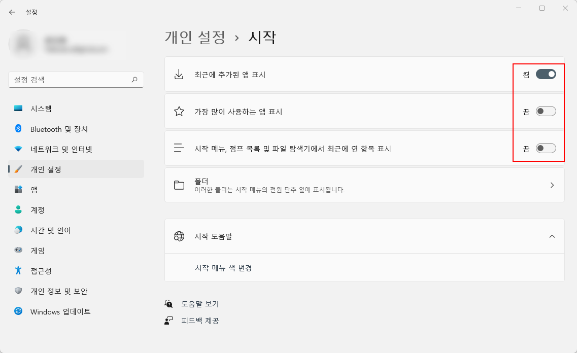 전부 '끔'으로 설정해서 시작 버튼의 맞춤 항목에 아무것도 안 나오게 설정할 수 있죠.