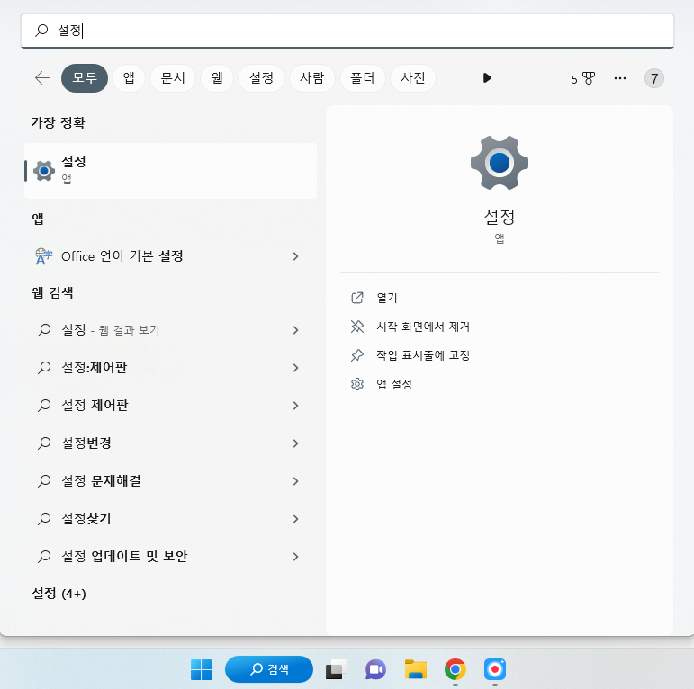 시작버튼(윈도우 로고 키)을 눌러서 톱니바퀴 모양 로고의 '설정'을 클릭하거나,그 옆의 '검색' 버튼을 클릭해서 '설정'이라고 입력하고 해당 앱을 실행합시다.