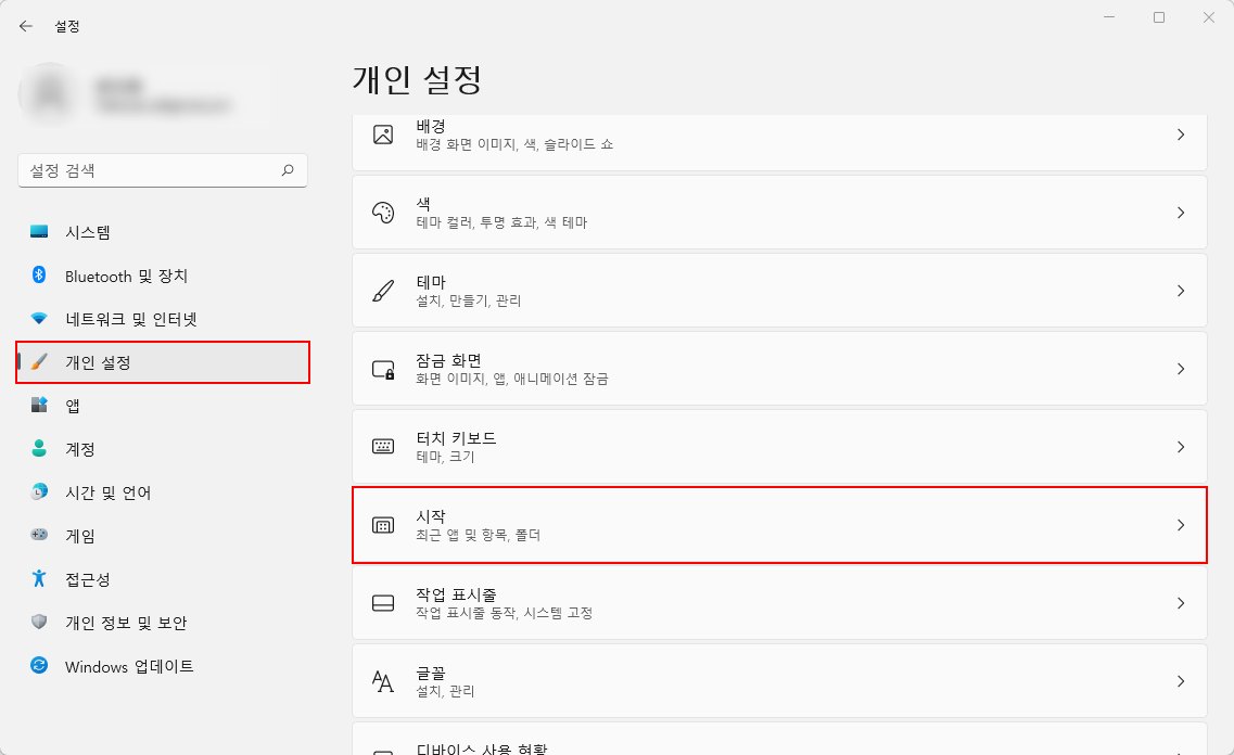 클릭하면 이렇게 '개인 설정' > '시작' 창으로 이동이 될 겁니다.