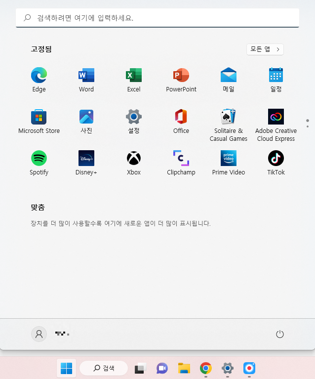윈도우11에서는 윈도우10과는 달리 시작버튼(윈도우 로고키)을 누르면 최근에 설치한 프로그램만 나오는 것이 아니라, 최근에 열람하였던 파일 등이 나옵니다. 또, 자주 열람한 파일 등도 나옵니다.