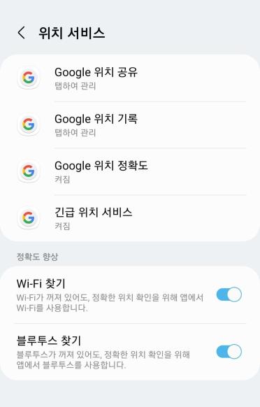 그럼 구글 계정이 나오며, 자주 사용하는 구글 계정으로 로그인해 주시면 되겠습니다. 이후 하단에 있는 정확도 향상에 'wi-fi 찾기'와 '블루투스 찾기'를 모두 켜주시고 나오시면 끝입니다.