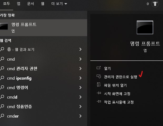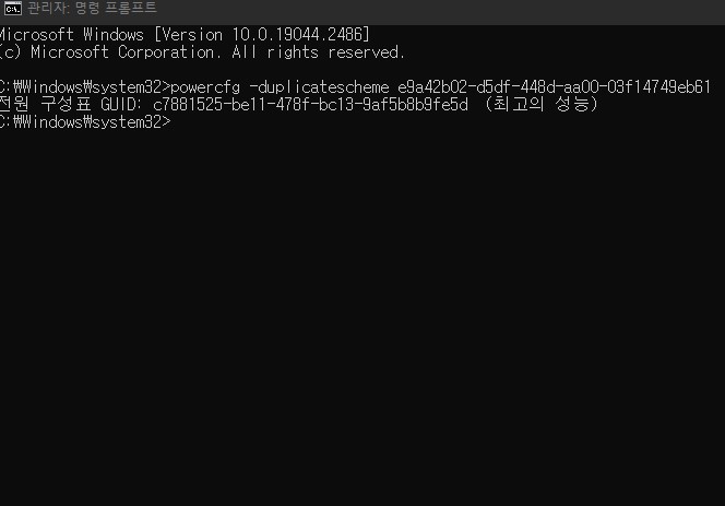 먼저 윈도우 검색바에 'cmd'를 검색하여 "관리자 권한으로 실행"하여 줍니다. 그다음 system32> 옆에 "powercfg -duplicatescheme e9a42b02-d5df-448d-aa00-03f14749eb61"를 입력 후 엔터 눌러 줍니다.