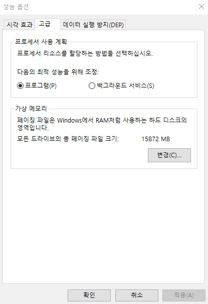 성능 옵션 창을 닫지 마시고 상단 메뉴바에서 '고급'을 클릭 후 프로세서 사용 계획 부분에서 '프로그램(P)'로 체크하여 줍니다.