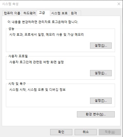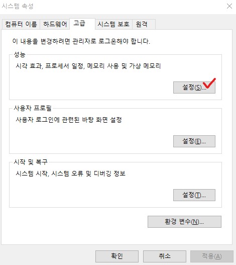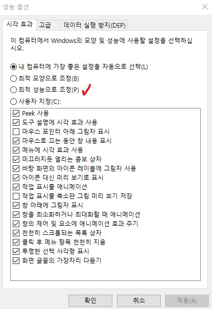 그럼 시스템 속성 창에 오게 되며, 여기서 성능 부분에 있는 '설정(S)'를 클릭 후 성능 옵션에서 '최적 성능으로 조정(P)'를 체크해 줍니다.