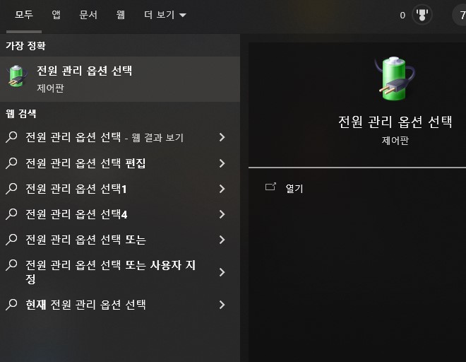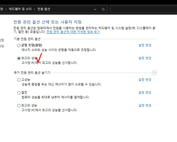 cmd를 닫아 주시고 윈도우 검색바에 '전원 관리 옵션 선택'을 검색하여 들어가신 다음 전원 관리 옵션에서 '최고의 성능'으로 체크하여 주시면 되겠습니다.