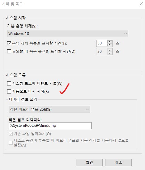 마지막으로 다시 시스템 속성 창으로 돌아와서 '시작 및 복구' 부분에서 '설정(T)'를 클릭 후 시스템 오류 체크 박스들을 모두 해제하여 줍니다.