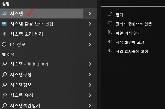 먼저 윈도우 검색바에 시스템을 검색하여 '시스템'으로 들어가 줍니다. 그다음 우측 메뉴에서 '고급 시스템 설정'을 클릭해 줍니다.