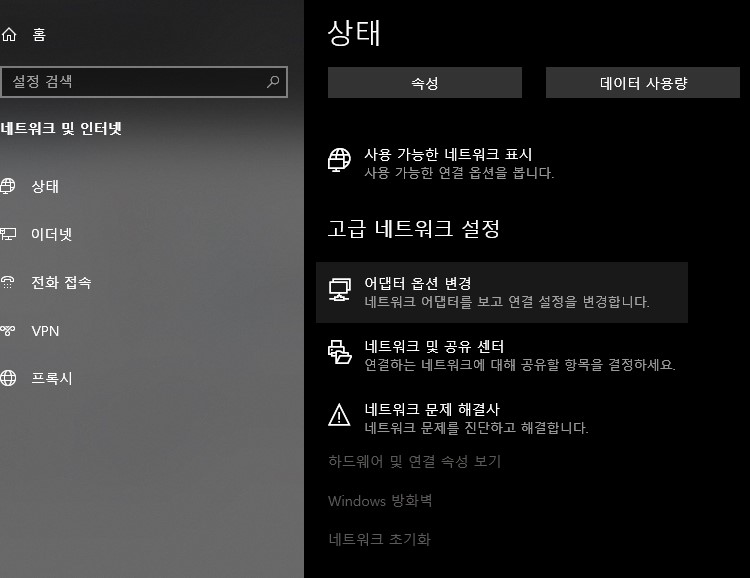 그다음, 네트워크 및 인터넷에서 고급 네트워크 설정 부분에 있는 "어댑터 옵션 변경"을 클릭해 네트워크 연결 창으로 진입합니다.