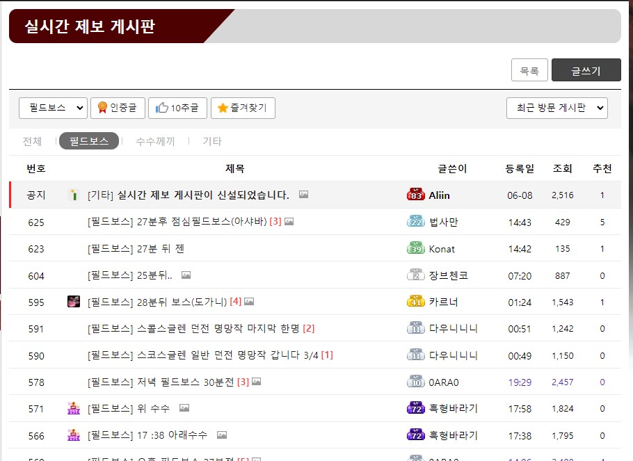 인벤 커뮤니티 실시간 제보 게시판을 확인하면 필드보스가 언제 나오는지 실시간으로 정보를 교환하는 커뮤니티가 있습니다. 해당 커뮤니티에서 정보를 얻고 필드보스를 잡아 흩어진 분광경을 얻으시면 좋습니다.