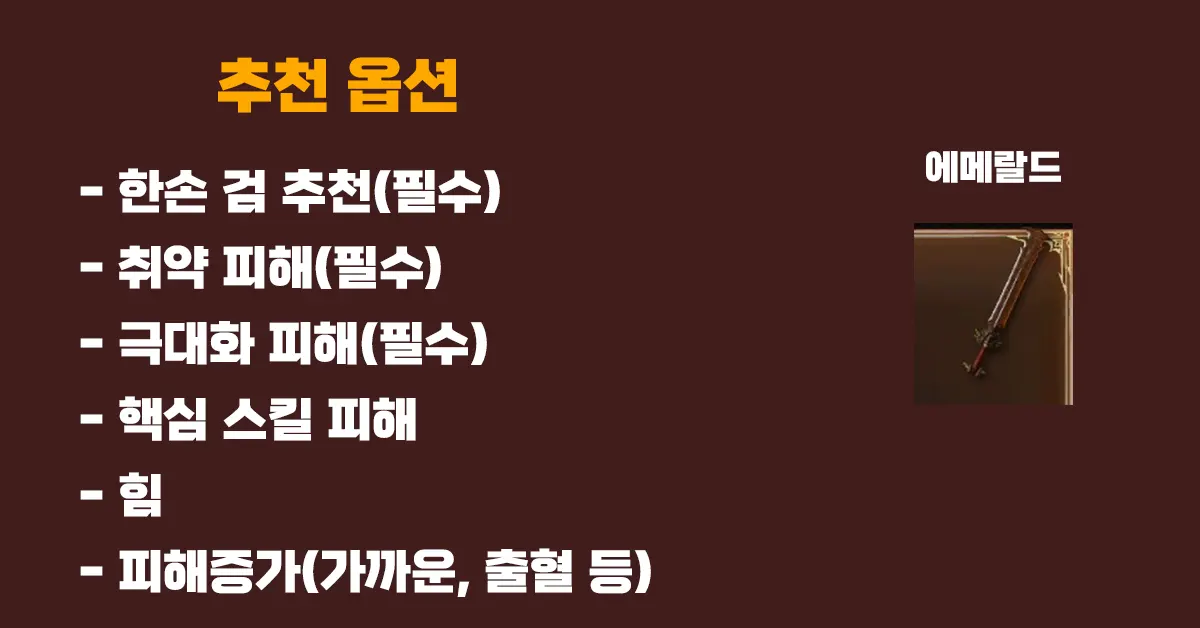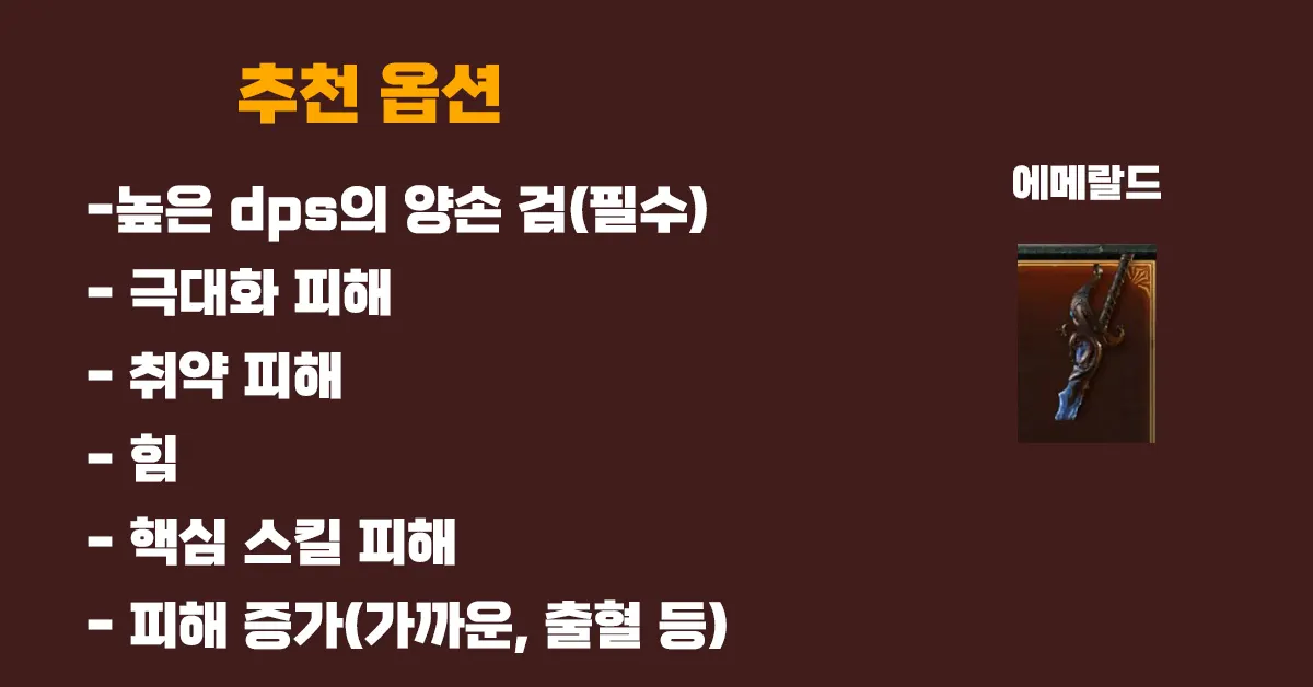 (필수)한 손 검: 한손 검은 극대화 피해량을 높여주며, 다른 쌍수 무기에 얻는 좋은 옵션이 있습니다.
