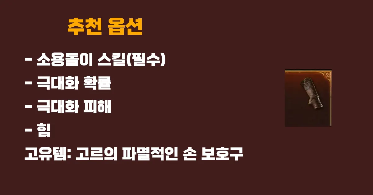 (필수)소용돌이 스킬: 장갑에서만 붙는 유일한 옵션으로 무조건 챙겨야 합니다.
