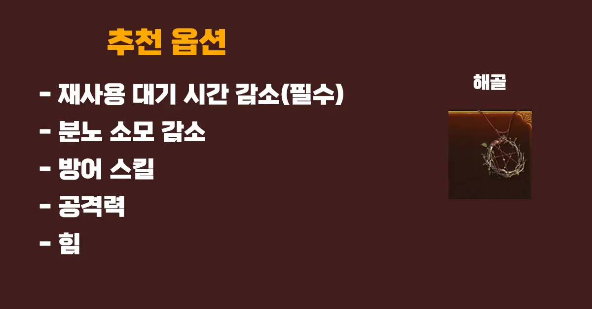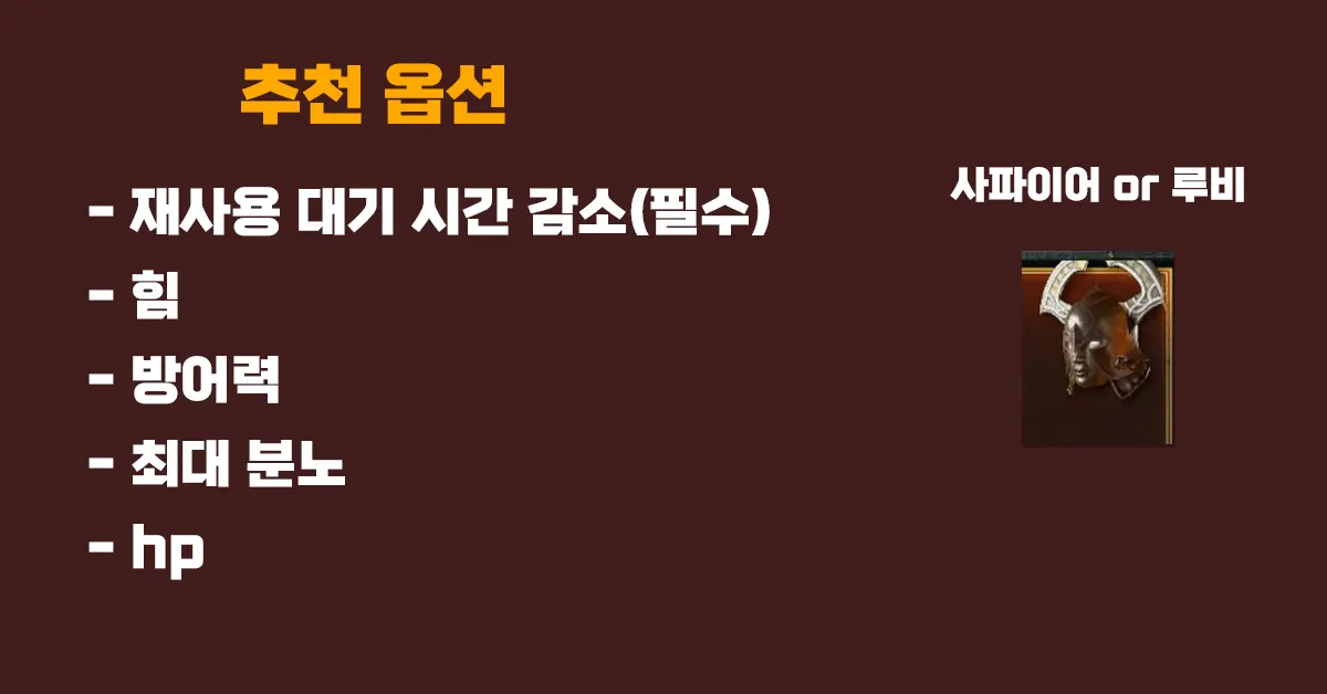 (필수)재사용 대기 시간 감소: 야만용사는 함성 스킬의 쿨타임을 줄이는 것이 좋습니다. 최대한 줄일 시 무한으로 함성이 유지가 되며, 투구에서 잘만 붙는다면 10% 이상의 수치로 줄일 수 있습니다.