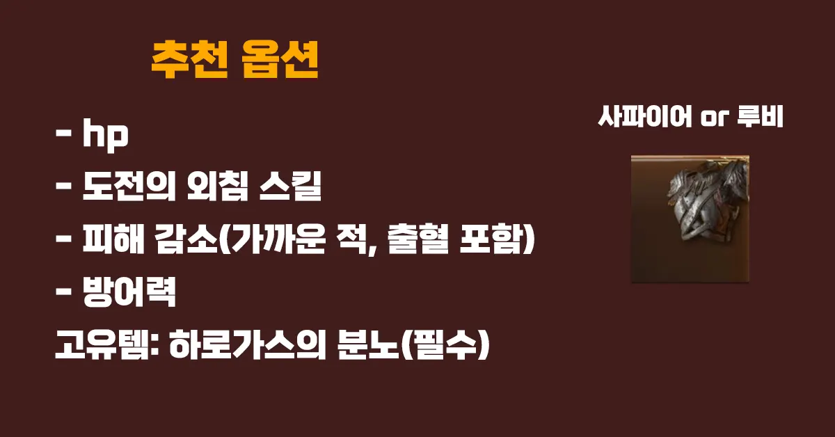 고유 장비인 하로가스의 분노는 공격과 방어를 챙길 수 있는 장비로 출혈 상태로 만들 시 비궁극기 스킬들에 쿨타임을 줄여줘서 함성 유지에 도움이 됩니다.