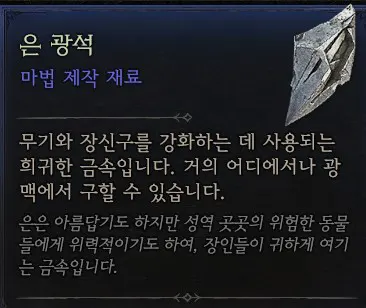 마을에 포션을 제조하는 연금술사한테서 자원 정제로 은 광석을 얻으실 수 있습니다. 다만 재료를 모아 만드는 것으로 '강철 덩어리' 10개가 소모됩니다. 제작 비용은 1회 당 200 골드 정도로 저렴한 편입니다.