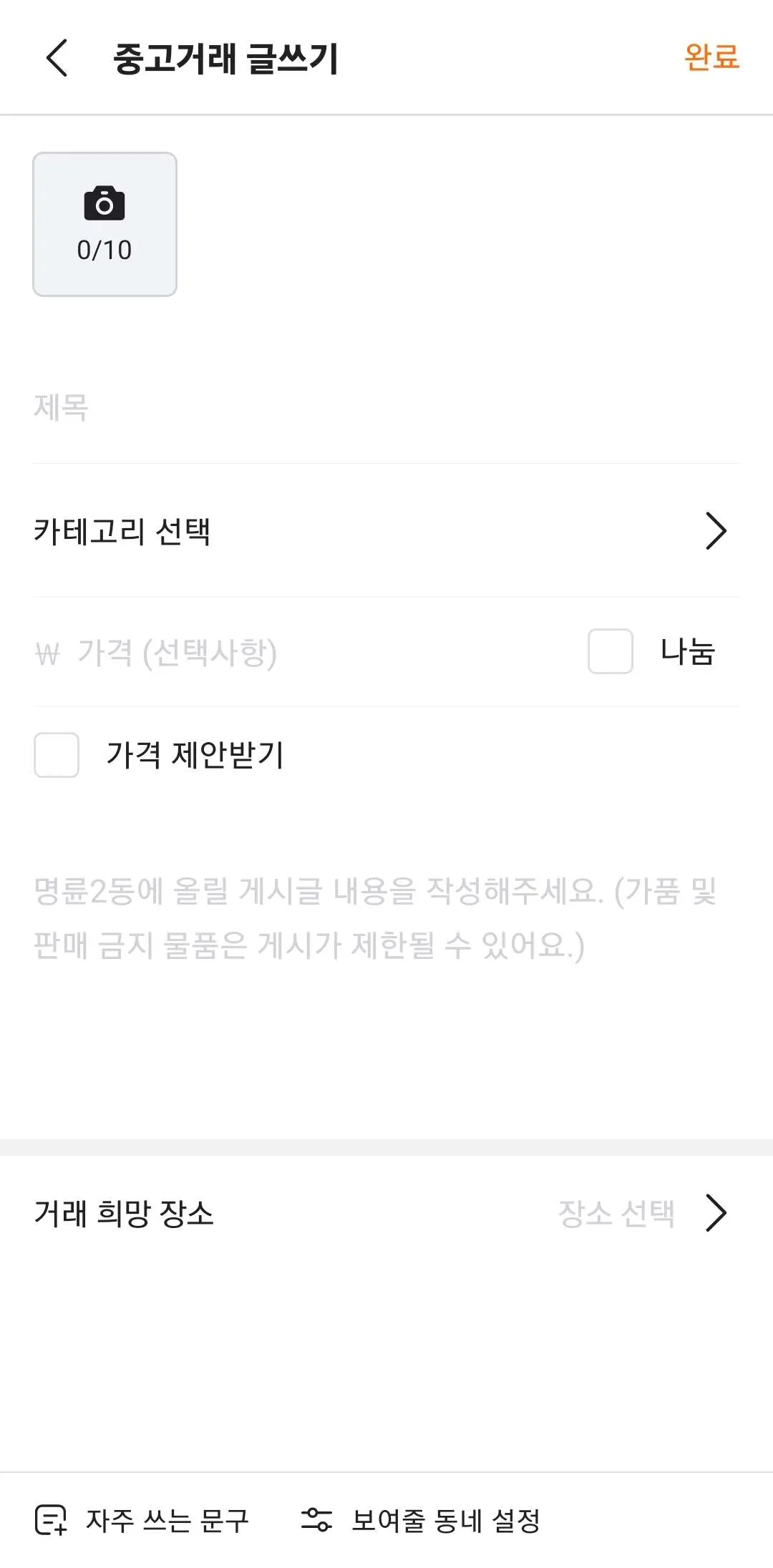 그리고 판매할 물건의 사진, 카테고리, 가격, 내용, 희망 장소를 적습니다.