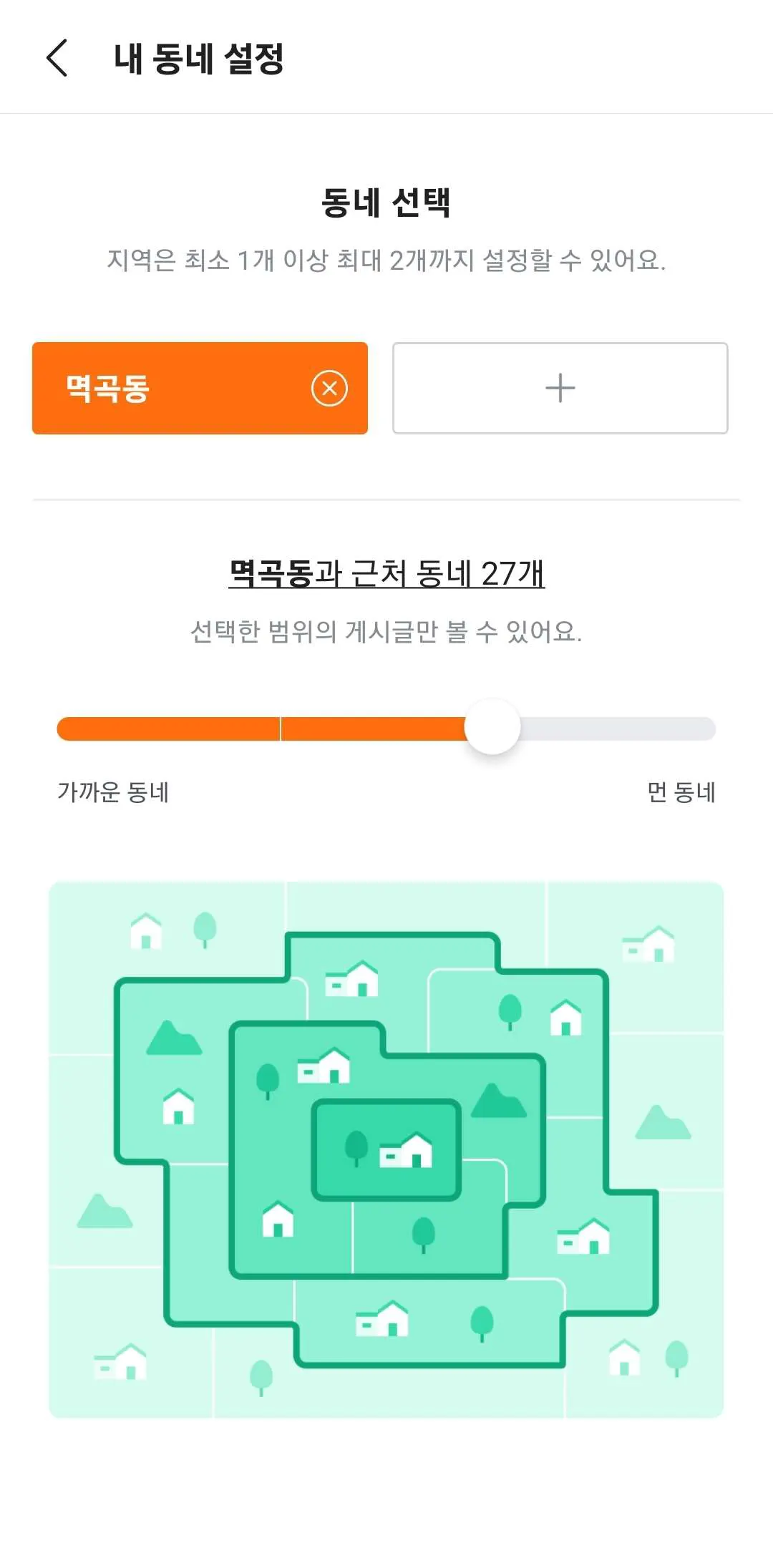 이동수단인 차가 있다면 먼 동네까지 설정하시고 이동수단이 없다면 근처 동네로만 설정하시면 됩니다. 추천하는 거리는 딱 중간입니다. 중간으로 할 경우 멀지도 않고 매물도 적당히 나옵니다.