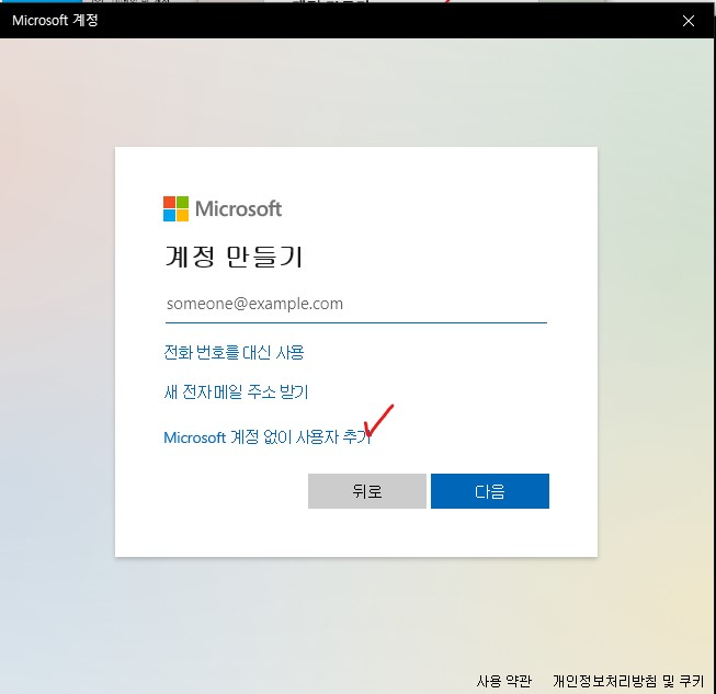 ○ 넘어오셔서 'Microsft 계정 없이 사용자 추가'를 클릭합니다.