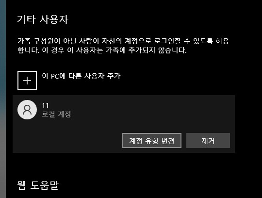 ○ 계정을 만든 후, 기타 사용자 설정 창에서 '계정 유형 변경'을 클릭하시고, 로컬(표준 사용자), 관리자에서 계정 유형을 선택하시면 됩니다.