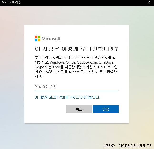 ○ 마이크로소프트 계정 입력 창에서 "이 사람의 로그인 정보를 가지고 있지 않습니다."를 클릭합니다. 계정이 있다면 입력합니다.