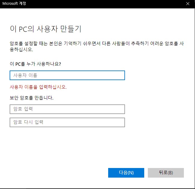 ○ 이 pc의 사용자 만들기에서 사용자 이름, 암호 입력을 마치시고 '다음(N)'을 눌러 계정을 생성합니다.