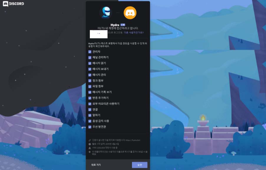 그러면, 위의 사진처럼 히드라가 사용하는 권한 안내를 하고, 무슨 서버에 추가를 할지 물어봅니다. '서버에 추가'의 값을 설정해 주세요. 히드라 bot을 추가하고픈 서버로 설정을 합니다.