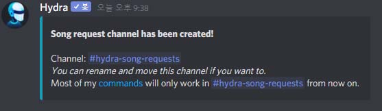디스코드 채팅 서버로 이동하면 히드라 봇이 추가된 것을 확인하실 수 있습니다. 이제 명령어를 입력해서 특정 작업을 할 수 있습니다. 히드라 bot의 분야는 "음악"입니다. 음악 관련 명령어들이 많죠.