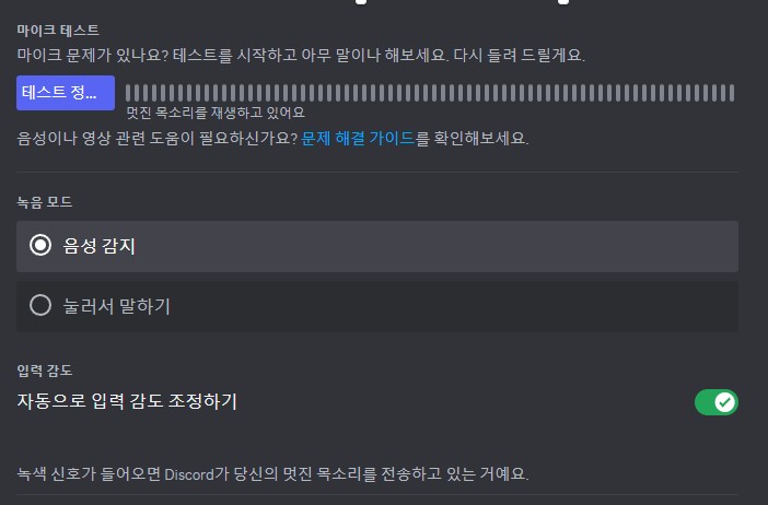 설정을 마치고, 하단에 보시면 마이크 테스트가 있습니다. 여기서 목소리가 얼마나 커졌는지 확인하실 수 있습니다.