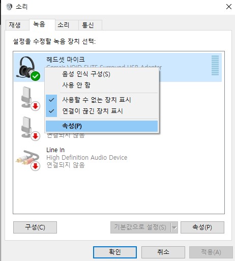 (4) 현재 연결 중인 마이크를 우클릭하여 선택 항목 탭에서 '속성(P)'를 클릭해 속성 창으로 엽니다.