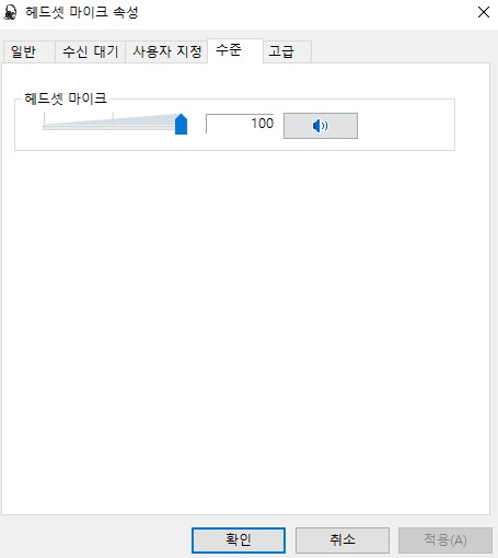 (5) 마이크 속성 창 상단 탭에서 '수준'을 클릭한 다음, 마이크 수치를 100이나 최대로 조절합니다.