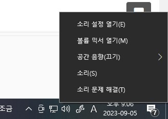 (1) 윈도우 창에서 우측 하단 작업 표시줄에 있는 소리 모양 아이콘을 우클릭해서 선택 항목을 엽니다.