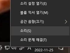 먼저 컴퓨터 화면에서 우측 하단의 소리 아이콘을 클릭하여 메뉴에서 "소리(S)"를 클릭합니다. 그럼 소리 설정 창이 나오며, 상단 메뉴바에서 "재생"을 클릭합니다.