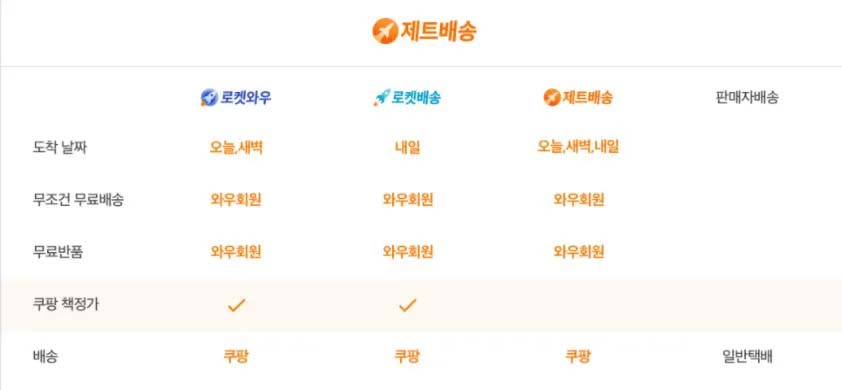 로켓 와우 상품은 도착 날짜가 당일일 때 새벽에 배송이 되며, 제트 배송은 당일이나 새벽 그리고 다음날 배송이 되고, 마지막으로 로켓 배송은 다음날 배송이 도착된다는 시스템을 가지고 있습니다.