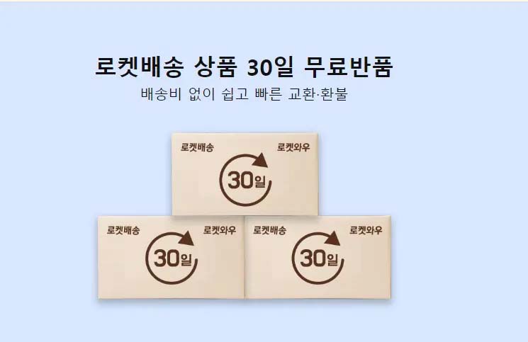 배송비 없이 쉽고 빠르게 반품, 교환해 주는 시스템으로 로켓 와우 회원이시면 반품비를 안 내셔도 되시며, 대부분 30일 내로 무조건 환불됩니다. 다만 주문 제작 상품이나 물건 소비자 과실 등은 힘들 수 있습니다.