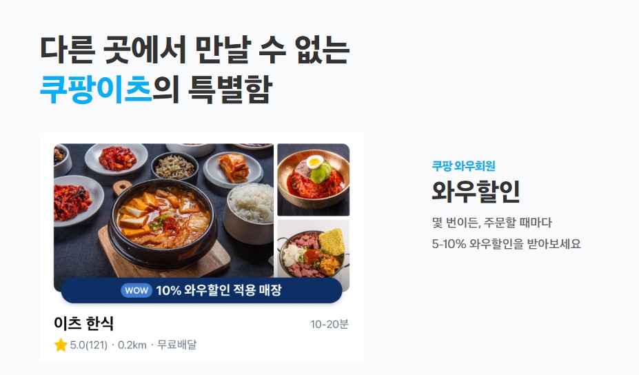 배달 3사 어플 중 하나인 쿠팡이츠에서 와우 회원에게는 와우할인이라는 5~10%까지 할인을 받을 수 있습니다. 할인에는 제한은 없으며, 주문할 때마다 wow가 있는 매장에서 와우할인 적용이 가능합니다.
