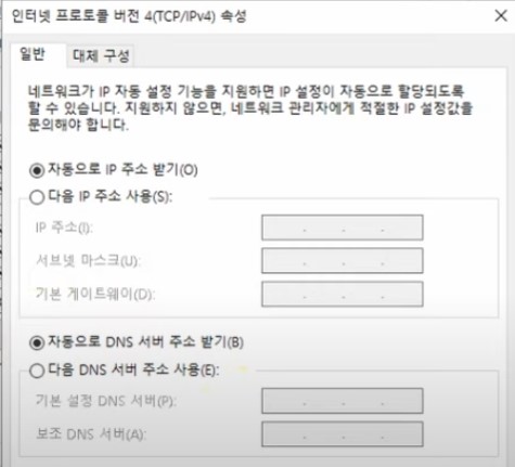 먼저, 무선 어댑터 속성 창으로 들어가시고 "인터넷 프로토콜 버전4(TCP/IPv4)"를 더블클릭합니다. 그럼 속성 창이 나오며, 여기서 "자동으로 ip 주소 받기(D)"와 "자동으로 DNS 서버 주소 받기(B)"를 체크하시고, 적용을 눌러 나오시면 됩니다.