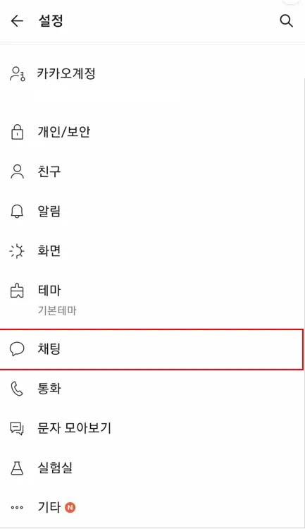 그럼 이러한 설정 화면으로 이동될 겁니다. 여러 옵션들이 보이죠. 여기서 중단 부분에 있는 '채팅' 옵션을 클릭합니다.