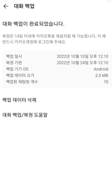 대화 백업이 전부 완료되었고, 복원은 14일 이내에 카카오톡 설치 시 가능하다고 나옵니다. 이 기기로 재설치를 해도 복원이 되고, 다른 기기로 설치를 해도 복원이 될 겁니다. 단, 카카오톡 계정으로 로그인을 해야만 가능하겠죠.