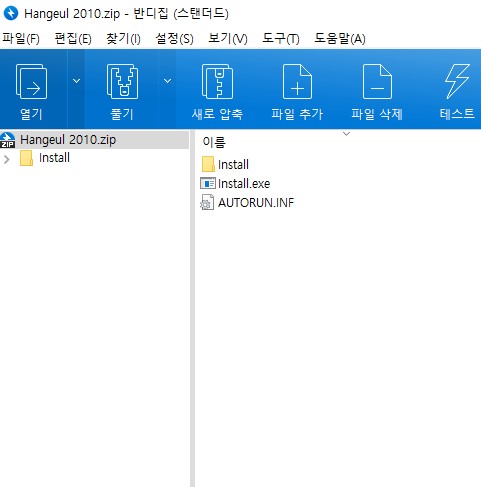 다운로드가 완료되면 Hangeul 2010.zip 압축된 파일을 풀어주세요. 풀 때는 아무 폴더에다가 풀어도 상관은 없습니다.