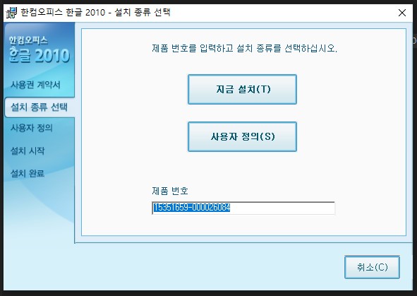 제품 번호를 입력하고 설치 종류를 선택하라는 문구가 나오지만 제품 번호는 사전에 입력되어 나오기 때문에 넘어가주시고, 위에 있는 '지금 설치(T)'를 클릭합니다.