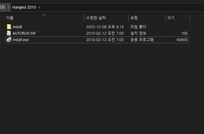압축을 다 풀면 정해놓은 자리에 Hangeul 2010 폴더가 나옵니다. install.exe를 클릭해 한글 2010 설치기 열어주세요.