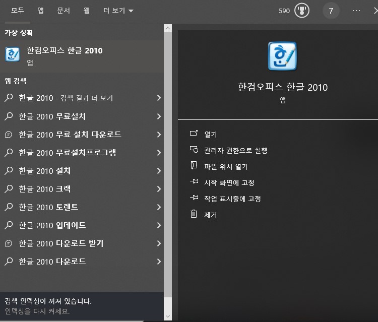 또는 윈도우 키를 눌러 검색창에 '한글 2010'을 입력하면 프로그램이 나옵니다. 클릭하여 바로 실행할 수 있습니다.