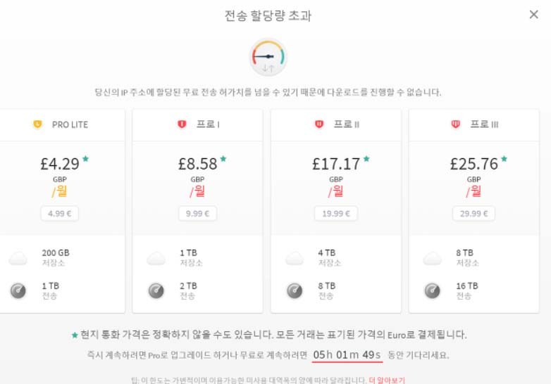 pro 요금제를 결제하거나 친구 초대 등의 도전과제를 해서 대역폭을 재충전시키거나 늘리는 방법이 있습니다.