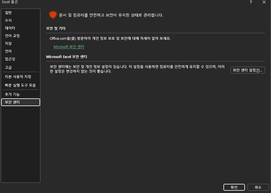 excel 옵션 창이 열리는데, 좌측에 메뉴목록바에서 '보안 센터'를 선택합니다. 그리고 메뉴에서 '보안 센터 설정(T)'를 클릭합니다.