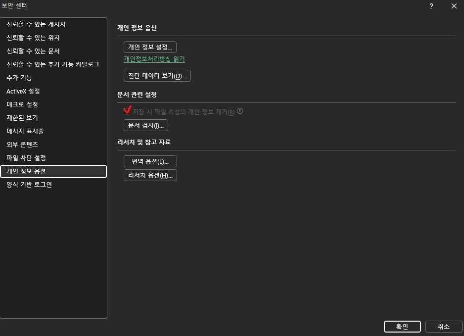 다시 한번 좌측 메뉴목록바에서 '개인 정보 옵션'을 선택합니다. 그리고 '저장 시 파일 속성의 개인 정보 제거(R)'을 체크 해주시면 됩니다.