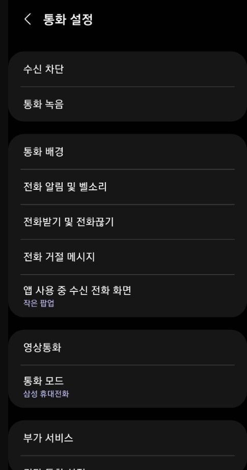 전화 키패드 우측 상단 버튼 터치 > 목록에서 설정 > 통화 설정에서 수신 차단 > 알 수 없거나 발신번호표시제한 번호 차단을 활성화하기